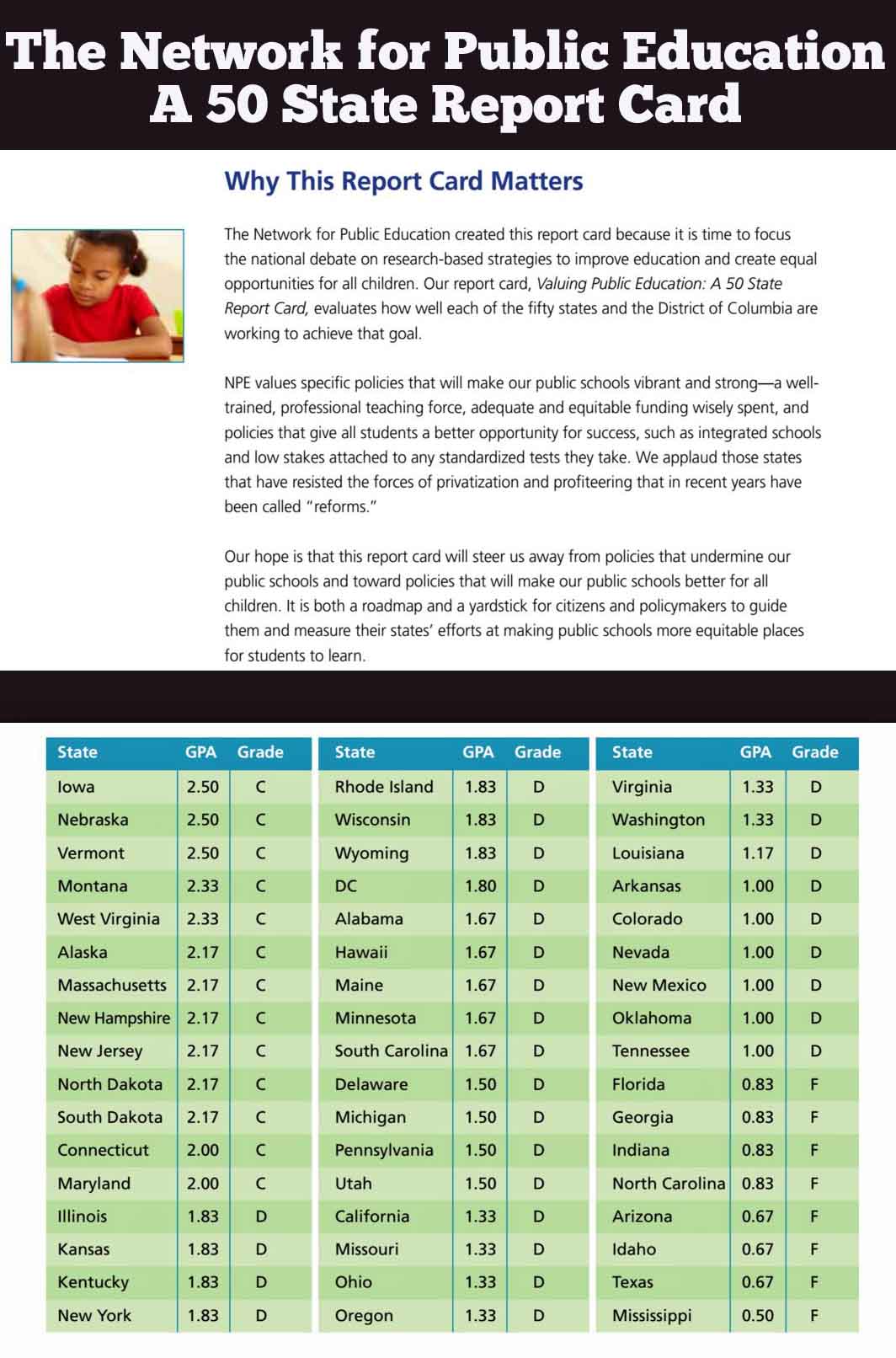 - To read the detailed 31 page report go to: The Network for Public Education’s A 50 State Report Card